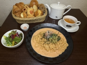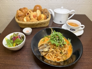 パスタ・おかわり自由の焼き立てパン・サラダorコーンスープ・選べるドリンク