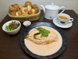 メイン・おかわり自由の焼き立てパン・コーンスープ・選べるドリンク