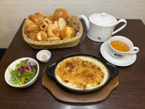 メイン・おかわり自由の焼き立てパン・サラダorコーンスープ・選べるドリンク