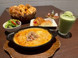 グラタン・おかわり自由の焼き立てパン・サラダorコーンスープ・選べるドリンク