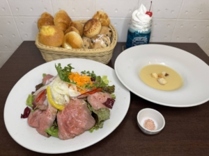 サラダ・おかわり自由の焼き立てパン・コーンスープ・選べるドリンク